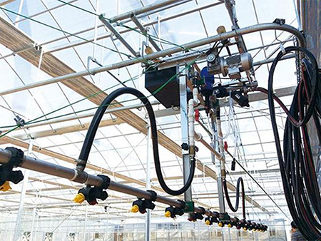 Для полива растений в наших теплицах используются переносные системы опрыскивания, работающие по принципу центробежной силы. Распылитель, как правило, устанавливается на верхней части теплицы. Опрыскиватели могут перемещаться с одного пролета на другой с помощью передаточного устройства. Система также оснащена контроллером, с помощью которого можно управлять скоростью перемещения и объемом распыления. Разбрызгиватели оснащены импортными распылительными соплами, каждое сопло имеет 3 головки распылителя. Мы также поставляем вращающиеся распылительные головки для регулировки количества распыления воды и формы распыления.